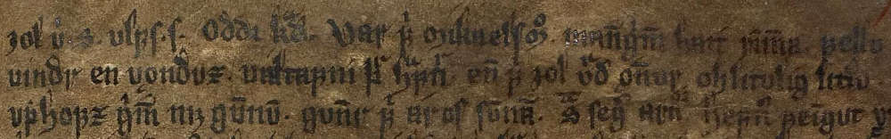 Première strophe du poème d'Oddr kíkinaskáld sur Magnús goði dans le manuscrit islandais Hulda (1350-1374).
